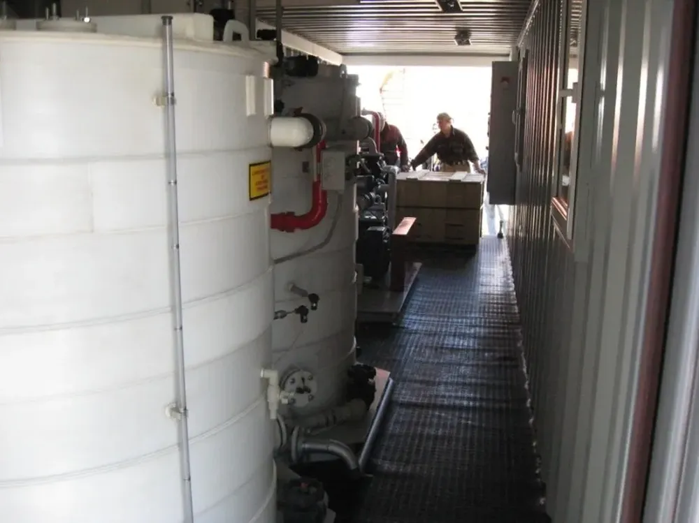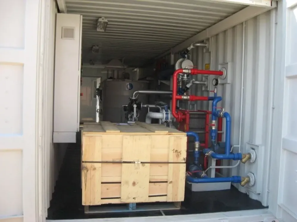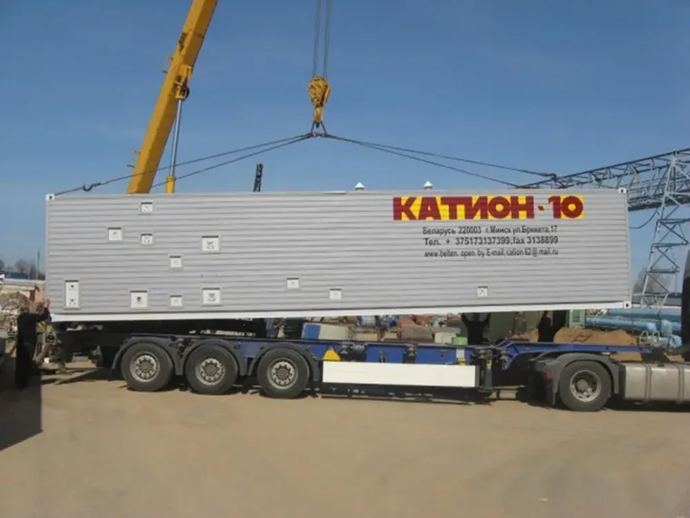 - Установка монтируется в морском контейнере повышенной высоты(HC), позволяющим оператору работать в просторном помещении, в котором установлена специально спроектированная система воздухообмена и вентиляции, которая снижает концентрацию паров кислоты при работе, и которая автономно обеспечивает циркуляцию воздуха во время консервации на зимний период, что особенно важно при хранении. Установки сторонних производителей не обеспечены такой системой – и, как правило, остаточные пары кислоты за время хранения в зимний период отрицательно воздействуют на исполнительные механизмы и электронику системы – вызывая коррозию, которая приводит их к выходу из строя;